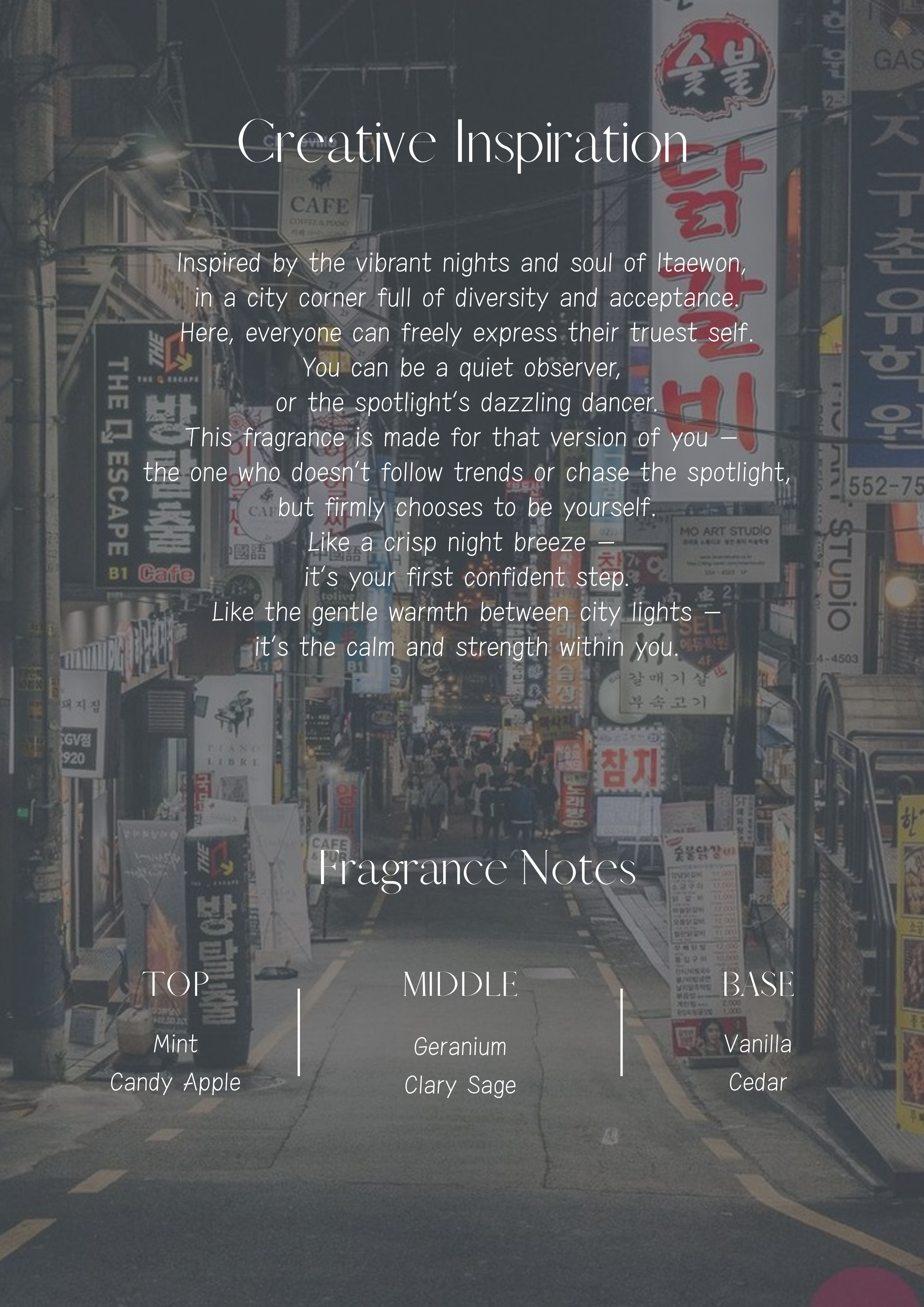 Refreshing, confident urban chic. Effortless cool with radiant energy. A refreshing trace that makes you pause amid the bustling city. Unspoken confidence and calm grace are hidden within the tender fragrance like you, walking through the night in I